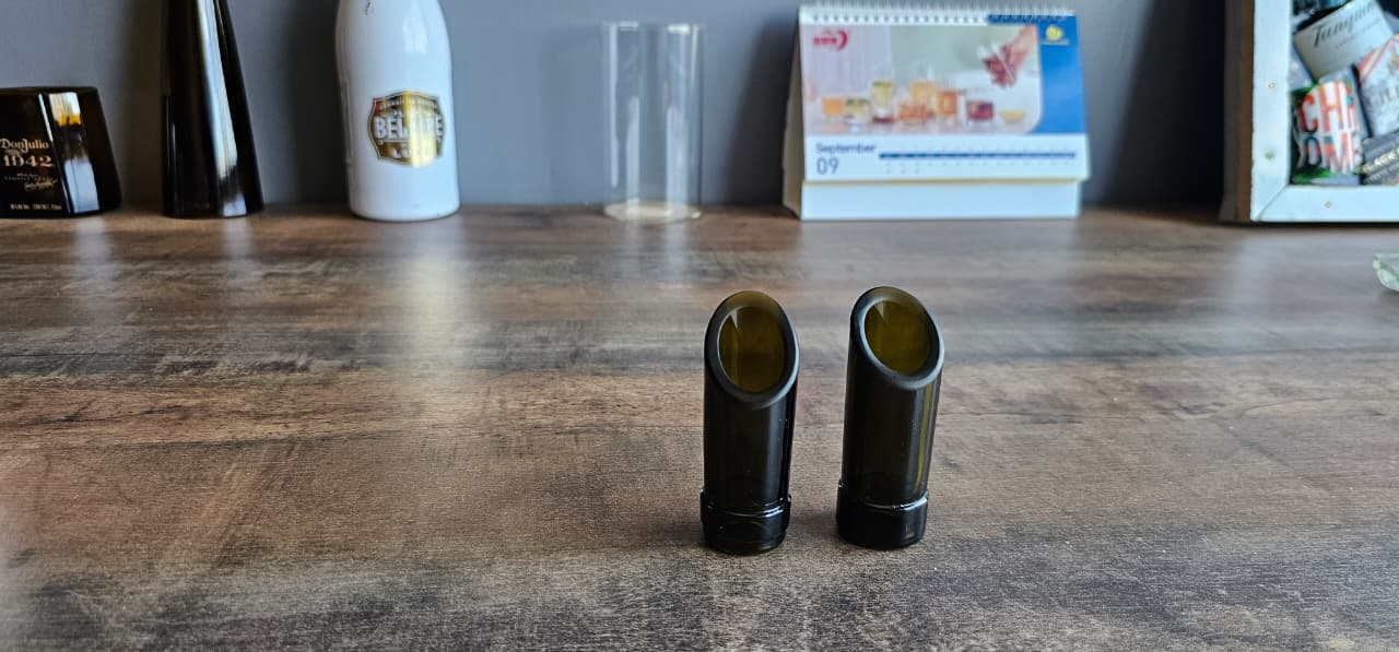 These striking shooters are crafted from the dark necks of wine bottles, featuring a sharp angle cut.