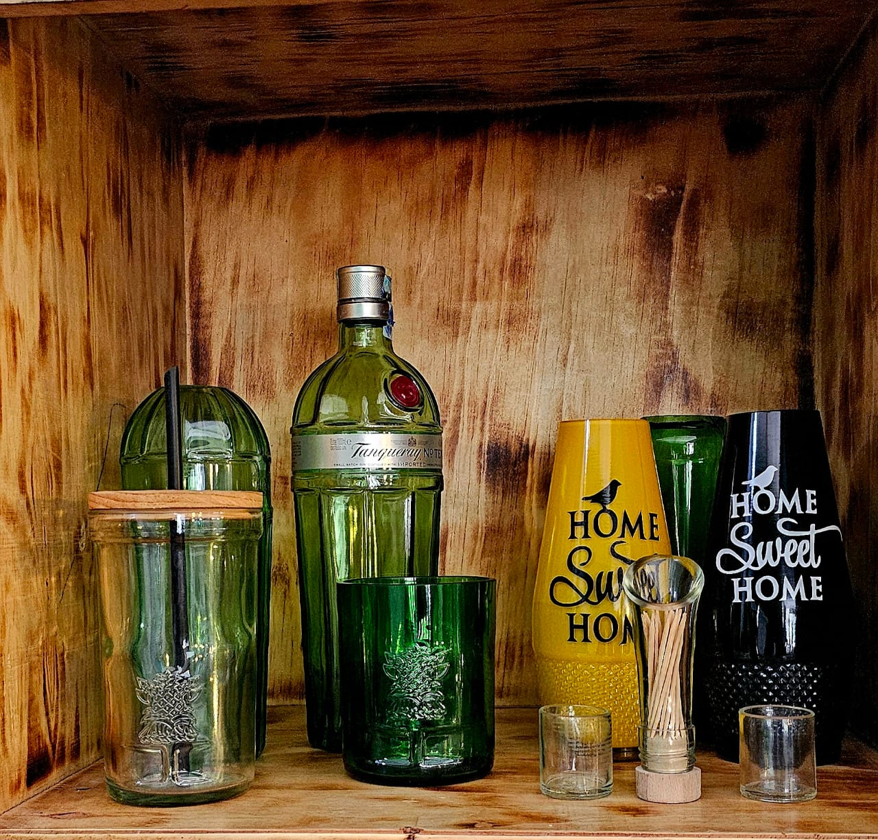Charming yellow and black upcycled bottle vases hand-painted with ‘Home Sweet Home’.