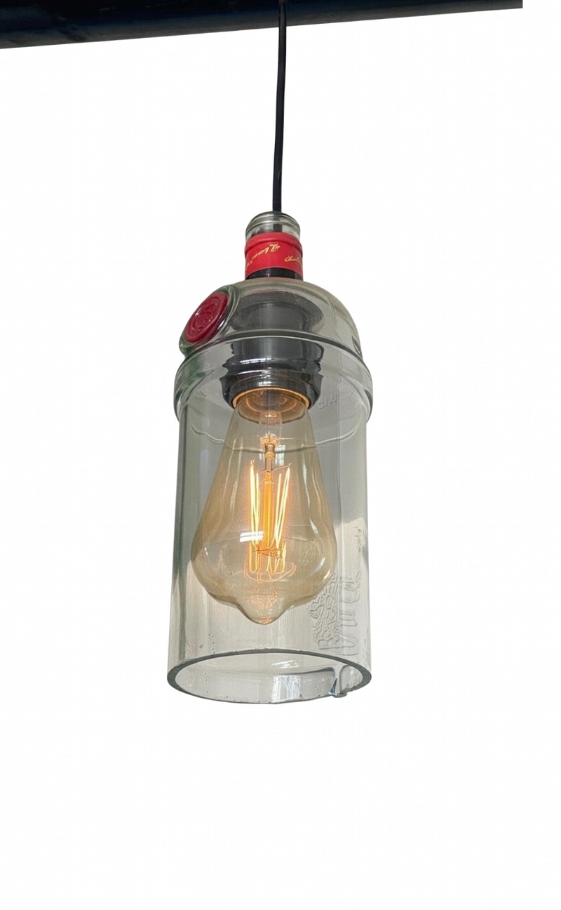 Minimalist clear glass pendant light made from upcycled spirit bottles. Features red accent ring.
